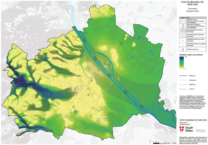 Nächtliche Kaltluft entsteht bei wolkenarmen, windschwachen Wetterlagen vor allem auf unversiegelten Flächen wie Wiesen, Feldern, Parks und in geringerem Ausmaß auch in Wäldern. Entlang topographischer Gefälle kann diese Kaltluft in der Nacht in Siedlungsgebiete abfließen und dort zu niedrigeren nächtlichen Temperaturen beitragen. Gerade während Hitzeperioden ist dieser Effekt für die Erholung der Bevölkerung von großer Bedeutung.